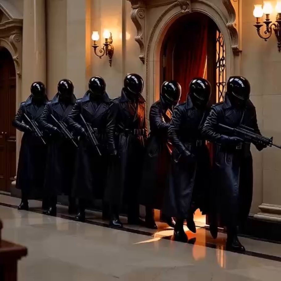 Люди в масках Этот промт для Grok Video создает сцену с восемью анонимными фигурами в глянцевых черных шлемах и… Смотреть