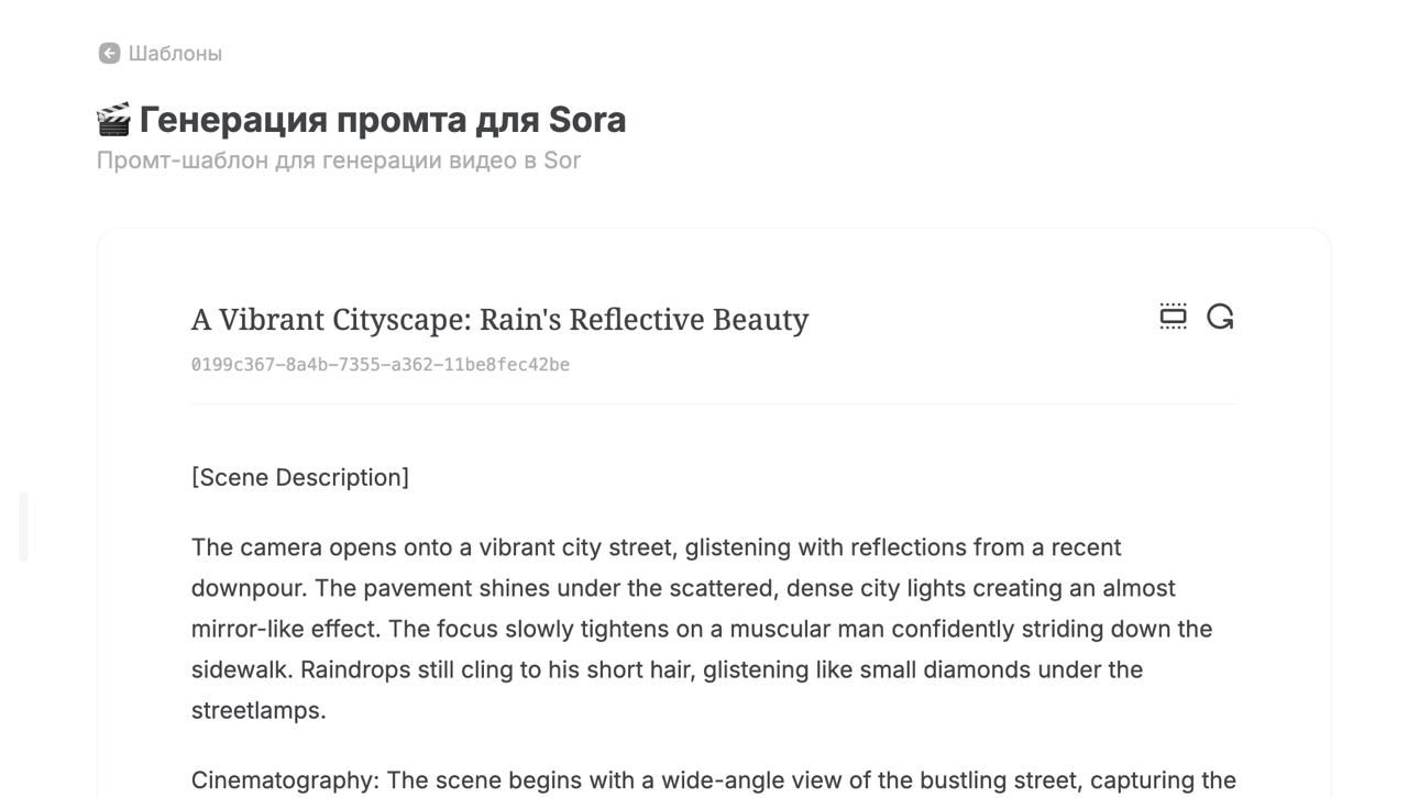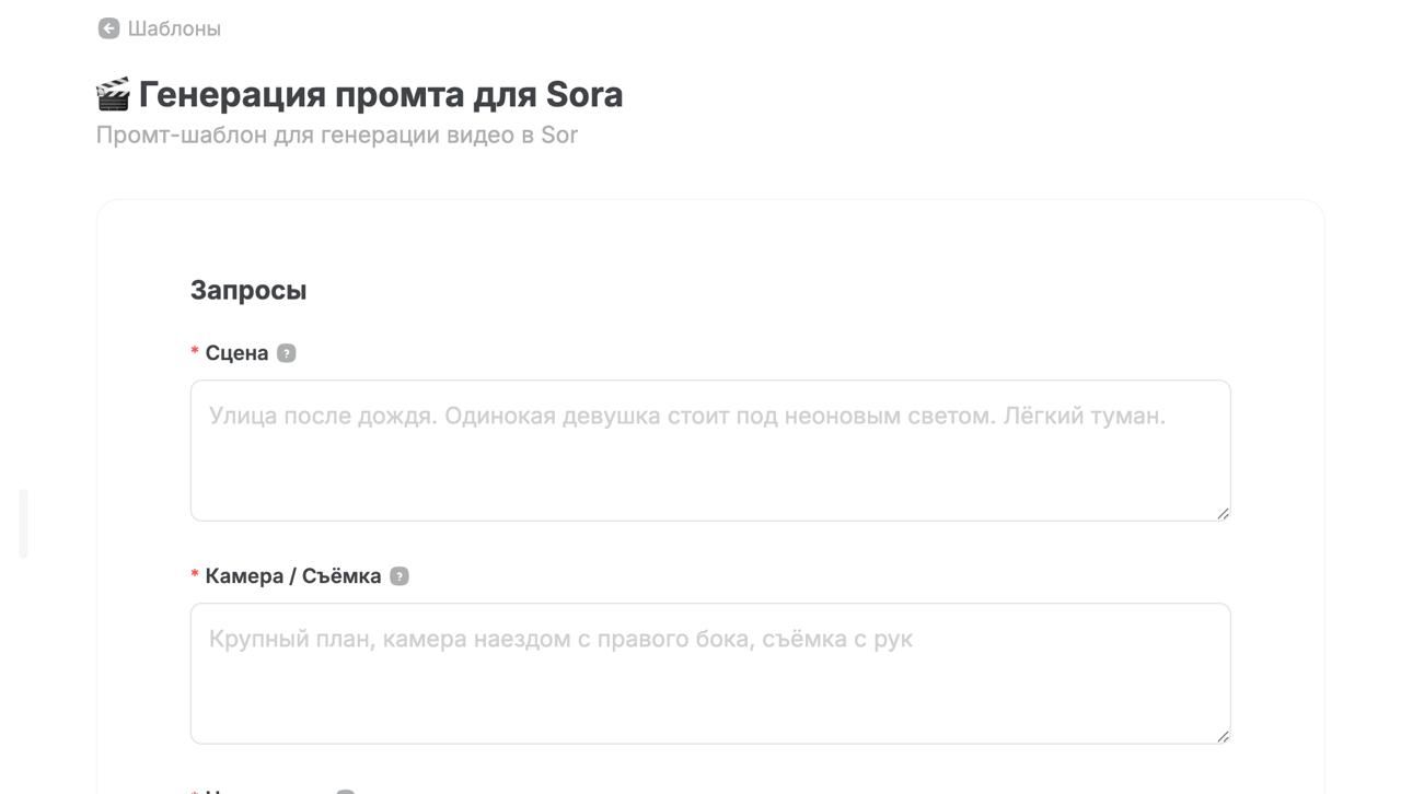 Там выбираешь шаблон «Генерация промта для Sora» — он выглядит как форма с полями “Сцена”, “Камера / Съёмка” и др.