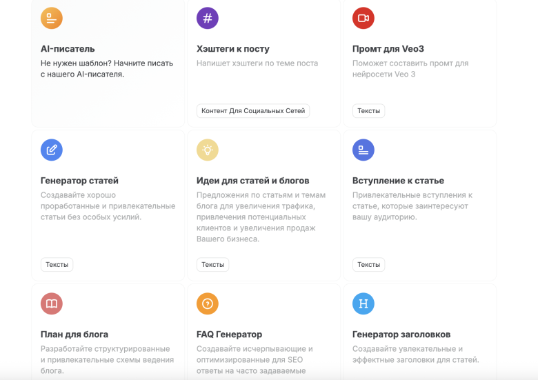Более 50 готовых шаблонов: статьи, SEO, маркетинг, посты, описания, видео-промты.