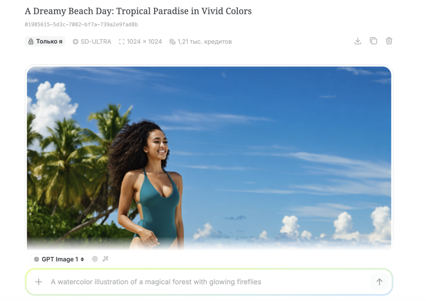 Встроенный генератор с выбором моделей (GPT Image, DALL·E, FLUX, SDXL и др.).