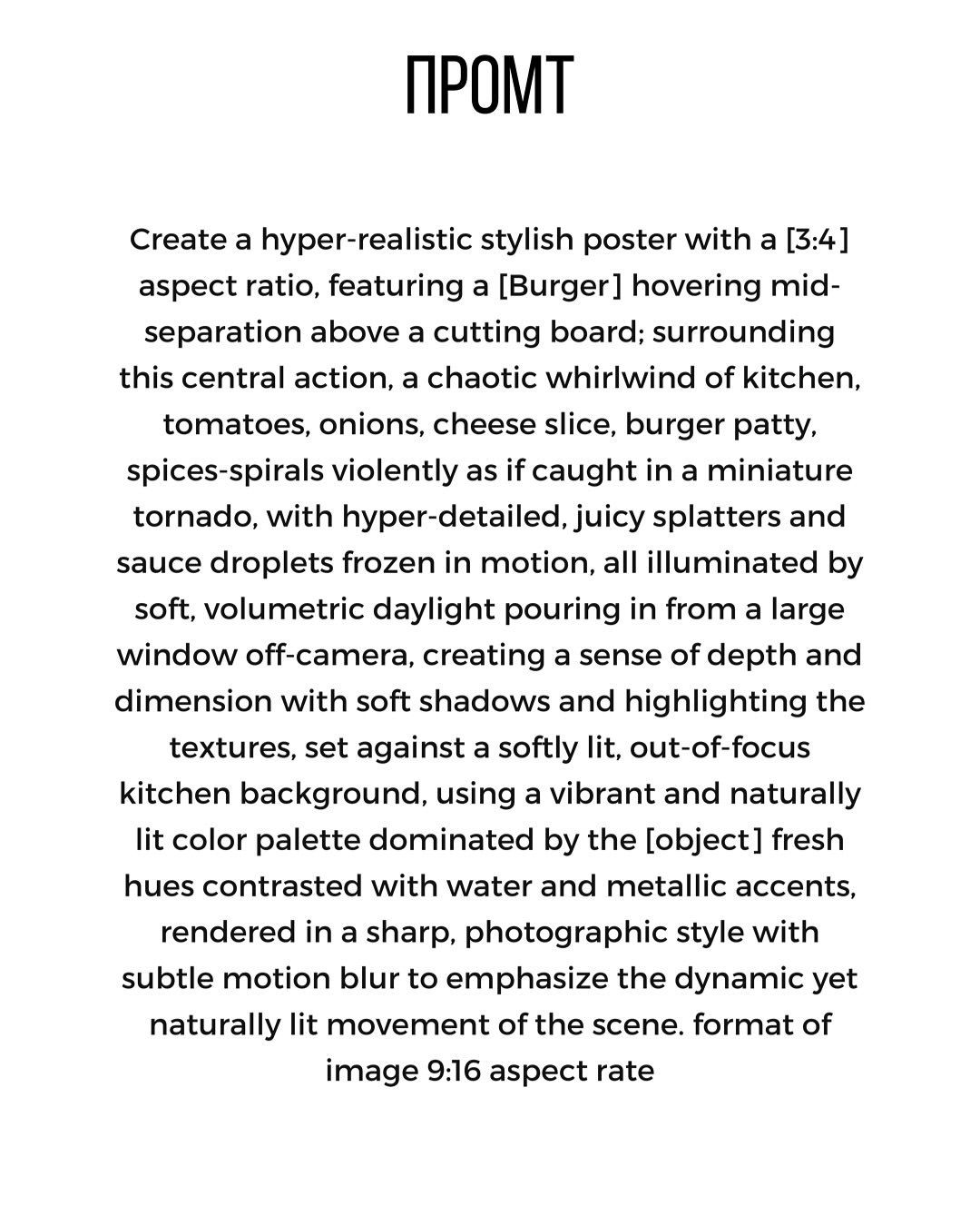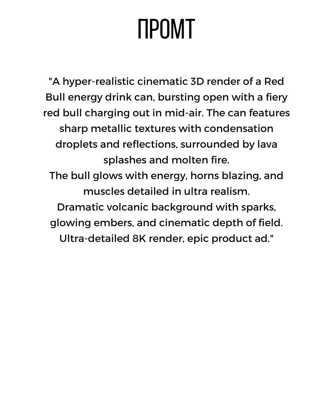 - Используйте фотографический язык: wide-angle shot, macro, low-angle perspective