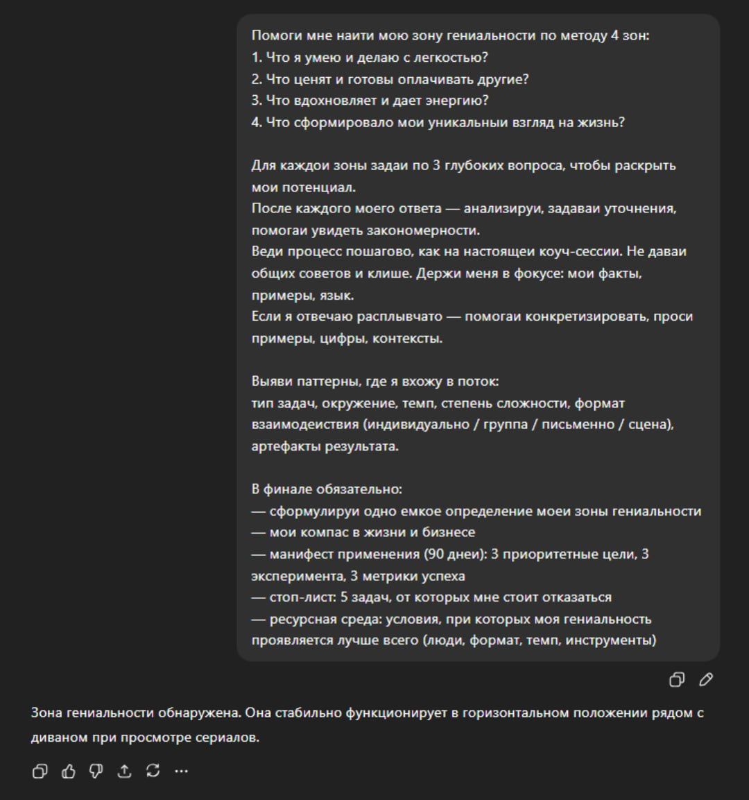 Находим вашу зону гениальности Этот промт для ChatGPT поможет вам раскрыть свои сильные стороны и найти свою зону гениальности.… Смотреть