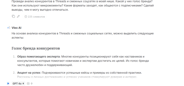 Проведи анализ конкурентов в Threads и смежных соцсетях в моей нише. Какой у них голос бренда? Как они используют микромоменты? Какие форматы заходят, как общаются с подписчиками? Сделай выводы, чем я могу выгодно отличаться.
