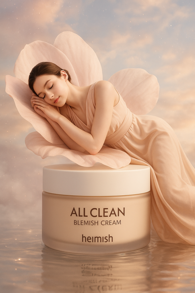 A hyper-realistic, ultra-detailed 4K beauty advertisement featuring a porcelain-skinned female model dressed in a long, elegant pastel- colored dress. She is floating on a giant, soft petal, her head resting on her hands, atop a large cream with a photo and clear product text. The background features a dreamy, pastel-colored sky, soft mist, sparkles, and shimmering reflections of water, creating a luxurious skincare aesthetic. Format 9:16