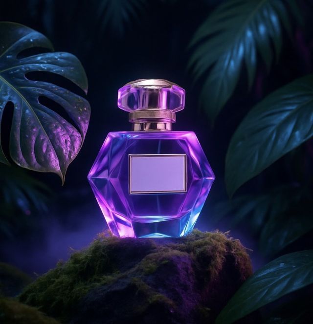 На фотографии изображён шестиугольный флакон духов, подсвеченный ярким фиолетовым и синим светом, стоящий на покрытом мхом камне. Флакон имеет золотистую крышку и пустую прямоугольную этикетку. На заднем плане крупные тёмно-зелёные листья, возможно, монстеры, создают пышную тропическую атмосферу, а лёгкая фиолетовая дымка добавляет ей мистической и чарующей атмосферы.