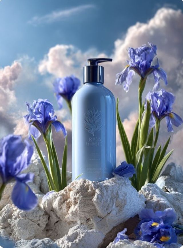 Фотография продукта: Флакон геля для душа Голубой ирис стоит на белом каменистом фоне на фоне неба, в окружении ирисов и облаков. Золотистый колпачок украшен каплями воды, источающих свежий аромат. Композиция подчёркивает красоту продукта, демонстрируя его элегантную форму и цветовую гамму