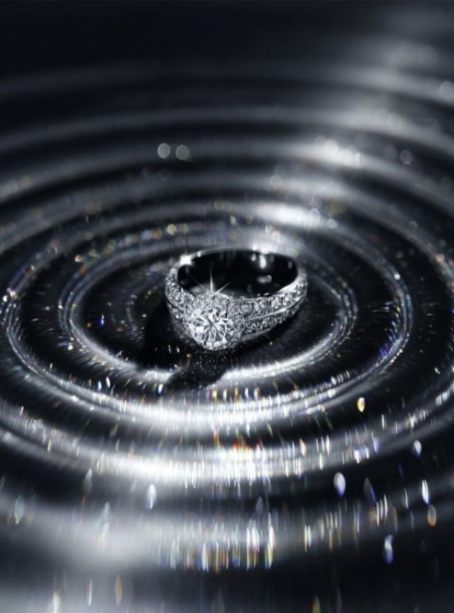 На фото представлен изысканный кольцо, утопающее в водной поверхности, создавая круговые ряды волн. Кольцо сверкает множеством драгоценных камней, что добавляет ему невероятного блеска и притягательности. Свет играет на его гранях, отражаясь мягкими искрами, которые создают атмосферу роскоши и элегантности. Фон выполнен в черно-серебристых тонах, подчеркивающих нежность и утонченность изделия. Эта композиция будто переносит зрителя в мир сказочной магии и мечтаний о великолепии.