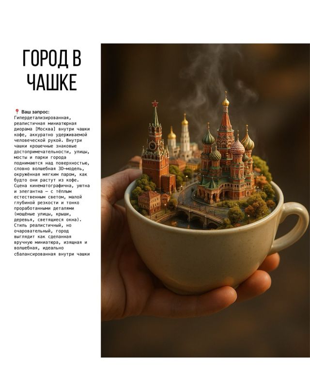 Гипердетализированная, реалистичная миниатюрная диорама [Ваш город] внутри чашки кофе, аккуратно удерживаемой человеческой рукой. Внутри чашки крошечные знаковые достопримечательности, улицы, мосты и парки города поднимаются над поверхностью, словно волшебная 3D-модель, окружённая мягким паром, как будто они растут из кофе. Сцена кинематографична, уютна и элегантна – с тёплым естественным светом, малой глубиной резкости и тонко проработанными деталями (мощёные улицы, крыши, деревья, светящиеся окна). Стиль реалистичный, но очаровательный, город выглядит как сделанная вручную миниатюра, изящная и волшебная, идеально сбалансированная внутри чашки.