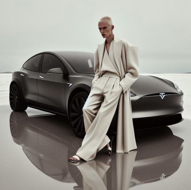 Это изображение выдержано в эстетике высокой моды с футуристическими нотами. На фоне минималистичного пейзажа запечатлена андрогинная фигура с ярким характером, облачённая в архитектурный силуэт светлого костюма. Геометричные линии наряда и строгая поза гармонично сочетаются с мощной формой современного автомобиля рядом. Холодная палитра, ровный свет и отражающая поверхность создают ощущение чистоты, силы и концептуальной изысканности, превращая кадр в редакционную историю о стиле будущего.