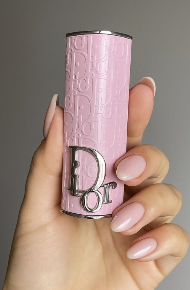 Фотография люксового продукта [губной помады Dior] в руке девушки с красивым маникюром. Серый фон с эффектом размытия. Упаковка представляет собой полную копию оригинала с высокой степенью детализации. Яркий естественный свет, блики, естественные тени, студийная рекламная съёмка