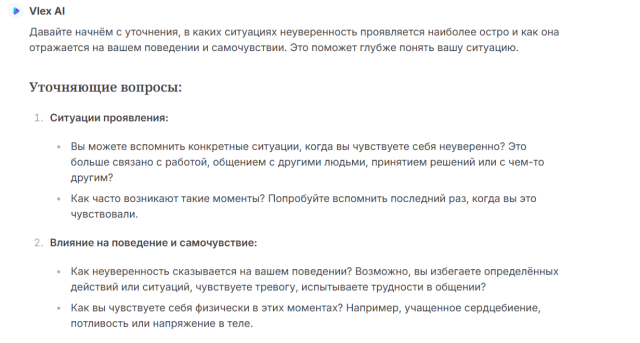 Твоя роль – опытный психолог. Я твой клиент, иногда я чувствую себя неуверенно, и это мешает мне по жизни. Сначала узнай, в каких ситуациях это острее всего проявляется и как отражается на моем поведении и самочувствии. Попробуй определить, что стоит за неуверенностью: страх, стыд или какие-то другие чувства. Предположи, откуда могла появиться такая проблема, задавай уточняющие вопросы, помоги мне структурировать мои мысли. Затем составь для меня инструкцию, какие упражнения помогут мне постепенно укреплять уверенность в своих силах.