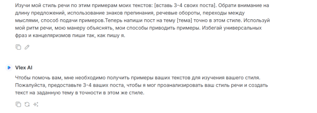 Изучи мой стиль речи по этим примерам моих текстов: [вставь 3-4 своих поста]. Обрати внимание на длину предложений, использование знаков препинания, речевые обороты, переходы между мыслями, способ подачи примеров.Теперь напиши пост на тему [тема] точно в этом стиле. Используй мой ритм речи, мою манеру объяснять, мои способы приводить примеры. Избегай универсальных фраз и канцеляризмов пиши так, как пишу я.