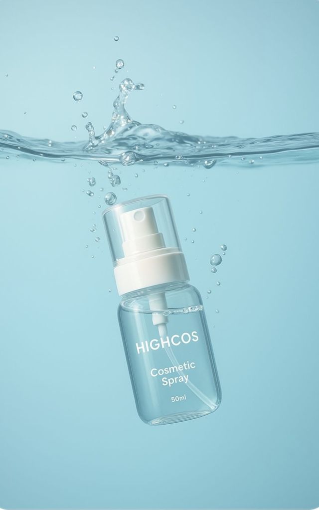 Реалистичное рекламное изображение прозрачного флакона-спрея премиум-класса объемом 50 мл с надписью «HIGHCOS Cosmetic Spray», выполненной минималистичным белым шрифтом.