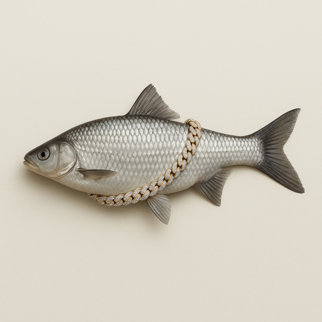 Realistic silver-grey fish top vew on plain light background, fish decorated with a sparkling diamond necklace curved along its body, surreal conceptual jewelry photography, minimalistic composition.