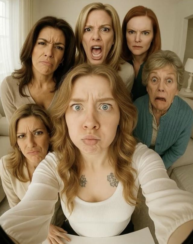Ультрареалистичное селфи в вертикальном формате 2:3 с эффектом «рыбий глаз». На фото я вместе с героями сериала «отчаянные домохозяйки» Сьюзан Майер, Габриэль Солис, Линетт Скаво, Бри Ван Де Камп и Карен Маккласки. У всех нас глупые, преувеличенные выражения лиц.