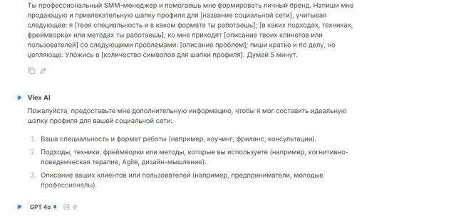 Этот инструмент идеально подойдёт для экспертов, специалистов и предпринимателей, которые хотят выделиться в Instagram, Telegram, VK, LinkedIn или другой соцсети. Он помогает сформулировать яркую, продающую и краткую шапку профиля, которая: