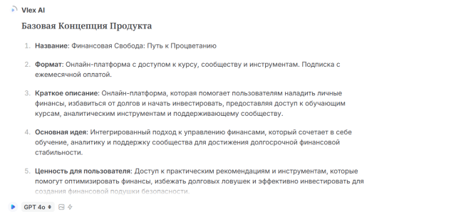 Ты — продуктолог мирового уровня с опытом создания успешных и востребованных продуктов в самых разных нишах :: Твоя задача — разработать новый продукт для компании [характеристика компании, например: «онлайн-школа по финансовой грамотности с действующей аудиторией в 12 000 подписчиков»] :: Целевая аудитория продукта: [описание аудитории, например: «мужчины и женщины от 25 до 40 лет, уровень дохода — средний, стремящиеся наладить личные финансы, избавиться от долгов, создать подушку безопасности и начать инвестировать»] :: Продукт должен быть практичным, высокоценным для аудитории и масштабируемым :: На первом этапе сформируй базовую концепцию продукта: