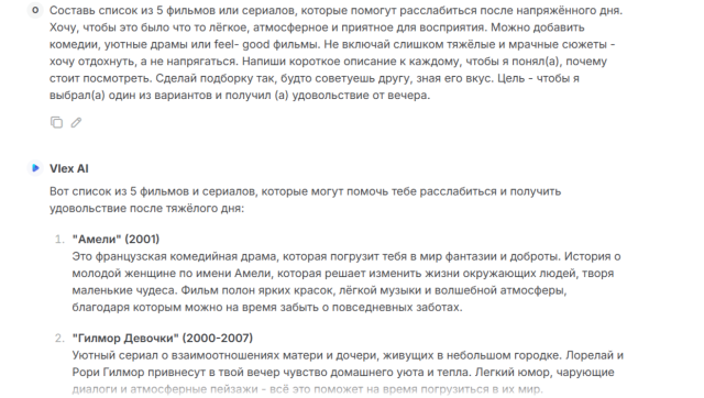 Откройте дверь в мир кино! Этот промт поможет Вам создать идеальную подборку из пяти фильмов или сериалов для полного расслабления. Независимо от того, любите ли вы захватывающие приключения, глубокие драмы или легкие комедии, он предложит разнообразные истории, которые наполнят каждый момент эмоциями и новыми впечатлениями. Вы можете подставить в промт свое описание желаемых сериалов или фильмов и он создаст подборку под Ваш вкус.