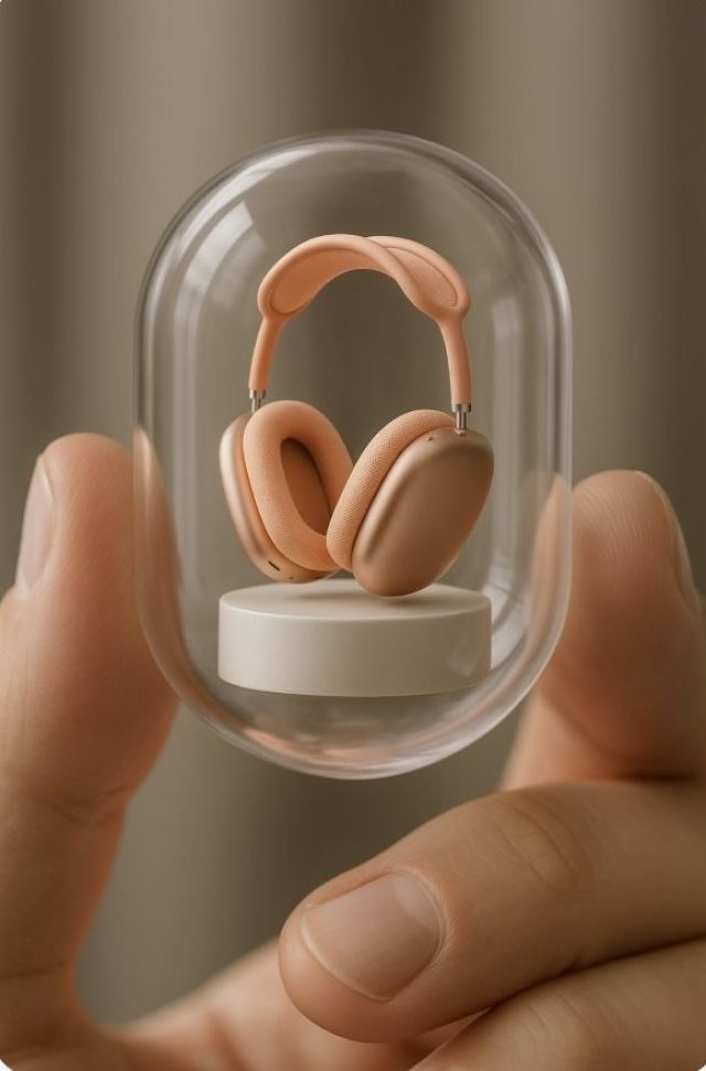 Перед нами изысканная визуальная композиция, в центре которой — пара стильных наушников нежного персикового оттенка. Они заключены в прозрачную колбу, напоминающую капсулу или стеклянный футляр, который словно бережно хранит ценный и утончённый предмет. Колба удерживается пальцами, и этот приём создаёт эффект интимности и аккуратности, как будто зрителю показывают маленький объект искусства или ювелирное украшение. Наушники выполнены в современном минималистичном дизайне, с мягкими округлыми формами и продуманными линиями. Их персиковый цвет вызывает ассоциации с теплом, уютом и эстетикой современного лайфстайла, подчёркивая гармонию между функциональностью и красотой. Текстура амбушюров и оголовья выглядит мягкой и тактильно приятной, что визуально усиливает ощущение комфорта и премиального качества.