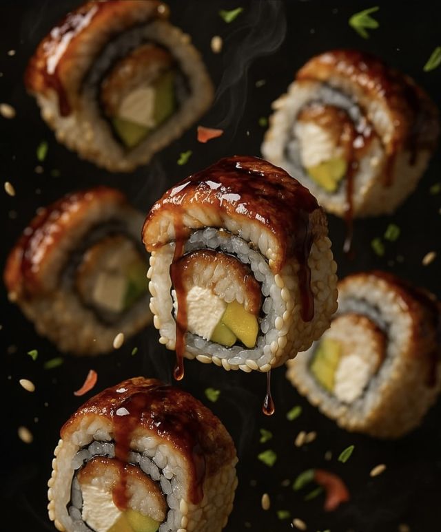 Кинематографический макроснимок 6-7 роллов урамаки с жареным унаги (угрём), крем-сыром Филадельфия авокадо и ярко-жёлтой маринованной редькой, зависших в воздухе в динамичной асимметричной композиции. Каждый ролл покрыт кунжутом, сверху сияет кусочек обжаренного угря, с которого стекает сладкий соус унаги. Вокруг разлетаются зёрна кунжута, рубленая микрозелень, струйки пара и летающие кусочки маринованного имбиря и зелёного лука. Глубина резкости подчёркнута: один ролл в сверхрезком фокусе, остальные растворяются в мягком боке, создавая эффект парения. Тёмный фон с тонким градиентом и кинематографическим боке усиливает текстуру и движение суши. Профессиональное фуд-фотоосвещение, гиперреалистичность, глубокие тени, стиль роскошной рекламной съёмки. Формат кадра 4:5