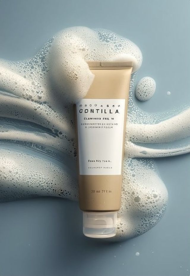 Редакционный снимок бежевого тюбика очищающей пены для лица Centella на нежно-голубом фоне. Поверхность покрыта пышными, воздушными пузырьками и кремовой пеной, плавно обволакивающей тюбик. Текстура пены мягкая и свежая, словно взбитая, что подчёркивает свежесть происходящего. Чистое, современное и мягко рассеянное освещение создаёт ощущение спа-салона