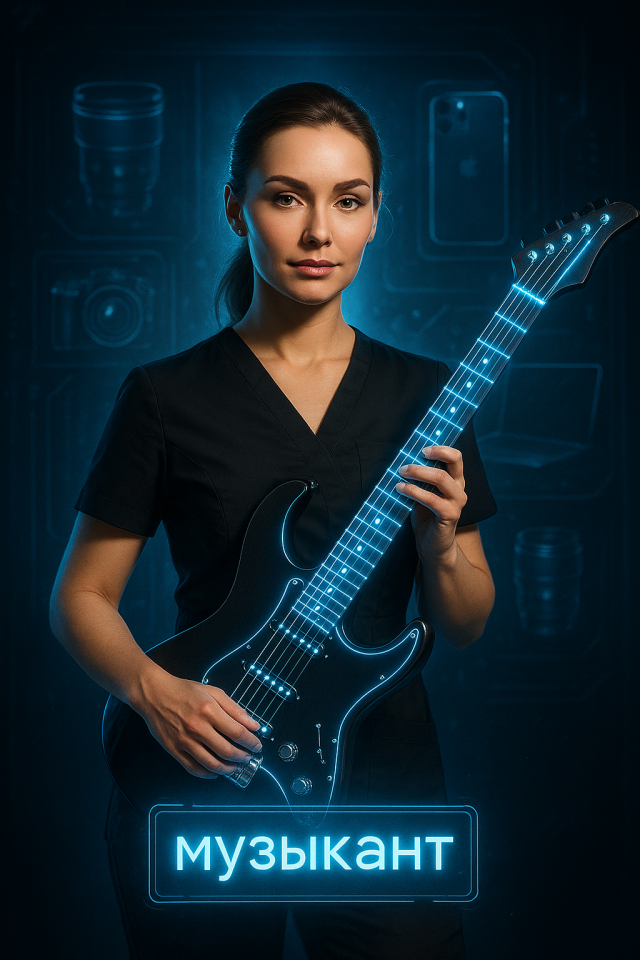 А confident female cosmetologist with Slavic features, wearing a sleek black uniform, holding a glowing futuristic [замените на Ваш предмет], with a high-tech holographic display in front of her showing the word [название Вашей профессии в кавычках], cyberpunk lighting in blue tones, backlight blue light, dramatic shadows, elegant professional makeup, soft light on the face, cinematic portrait style. on a background there are holographic images of lenses, iphone, macbook, and other professional photographers tools. Style it like a 1 image.