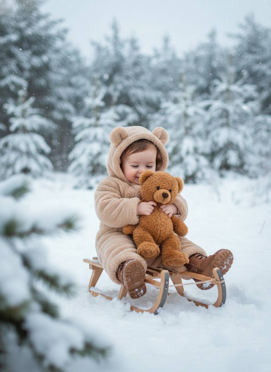 Не меняй черты лица ребенка с фото. Ребёнок, в зимней одежде сидит на санках и крепко держит плюшевого медведя. Он носит бежевую тёплую куртку с капюшоном и мягкими ушками, которая выглядит как плюшевый и уютный наряд для зимних прогулок. На его ногах — тёплые ботинки, идеально подходящие для снега. Вокруг — снежный лес, добавляющий зимнюю атмосферу. Ребёнок выглядит уютно и защищённо, его взгляд направлен на медвежонка, с которым он сидит, создавая атмосферу уюта и безопасности.