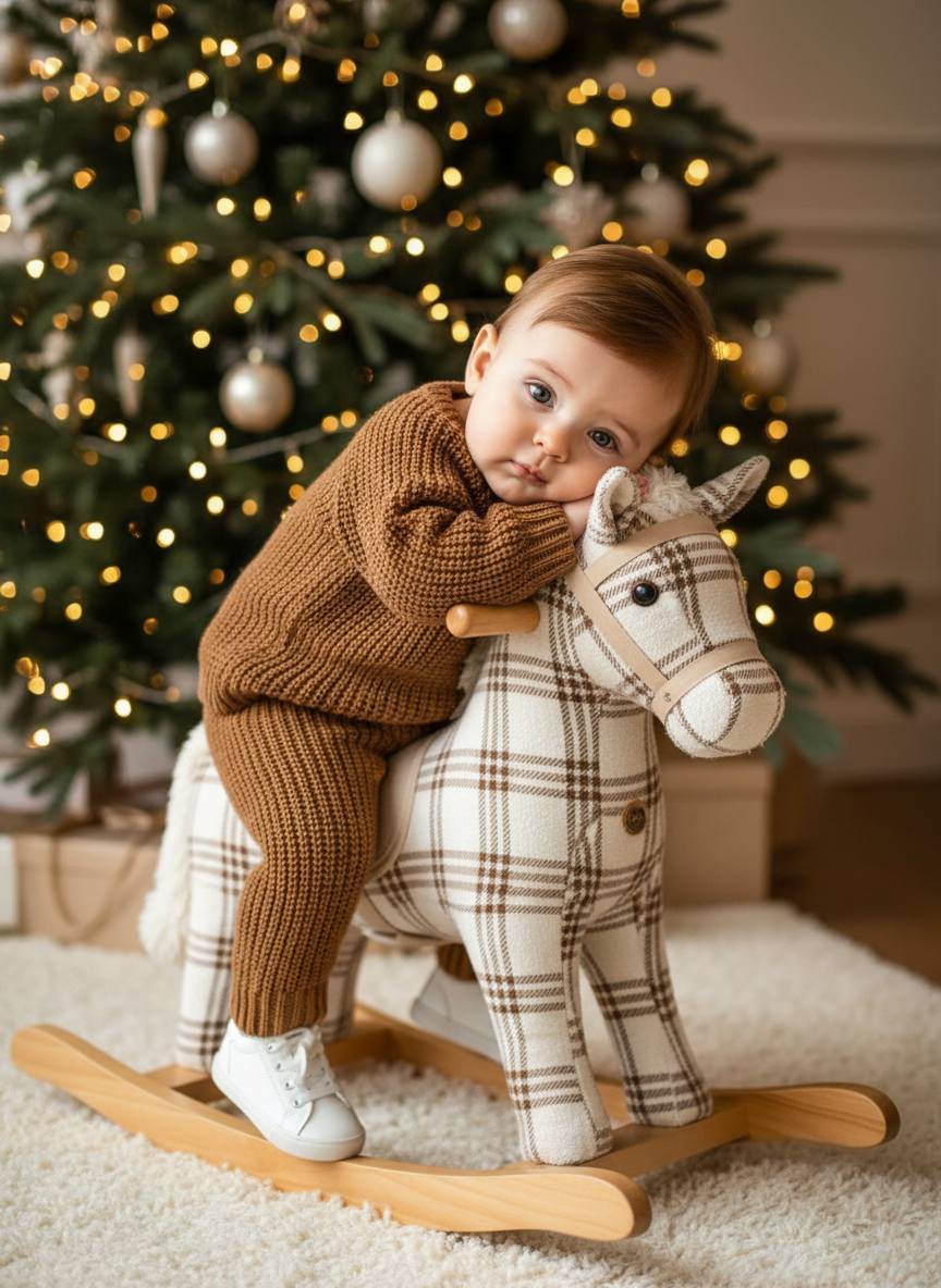 Не меняй черты лица ребенка с фото. Ребёнок сидит боком на мягкой качалке-лошадке, обтянутой тканью в бело-коричневую клетку. Он слегка наклоняется вперёд, обнимая голову лошадки и прислоняя щёку к её мордочке. Выражение лица спокойное и нежное. Одет в коричневый объёмный вязаный свитер и такие же штаны, с отчётливой текстурой плотной вязки. На ногах белые кроссовки с аккуратной подошвой. За ребёнком видно край большой ёлки в мелких огоньках. На полу пушистый белый ковёр. Освещение тёплое, гирлянда создаёт мягкое золотистое свечение. Качество 8K, видны изгибы вязки, мягкость ткани лошадки, блеск игрушек на ёлке.