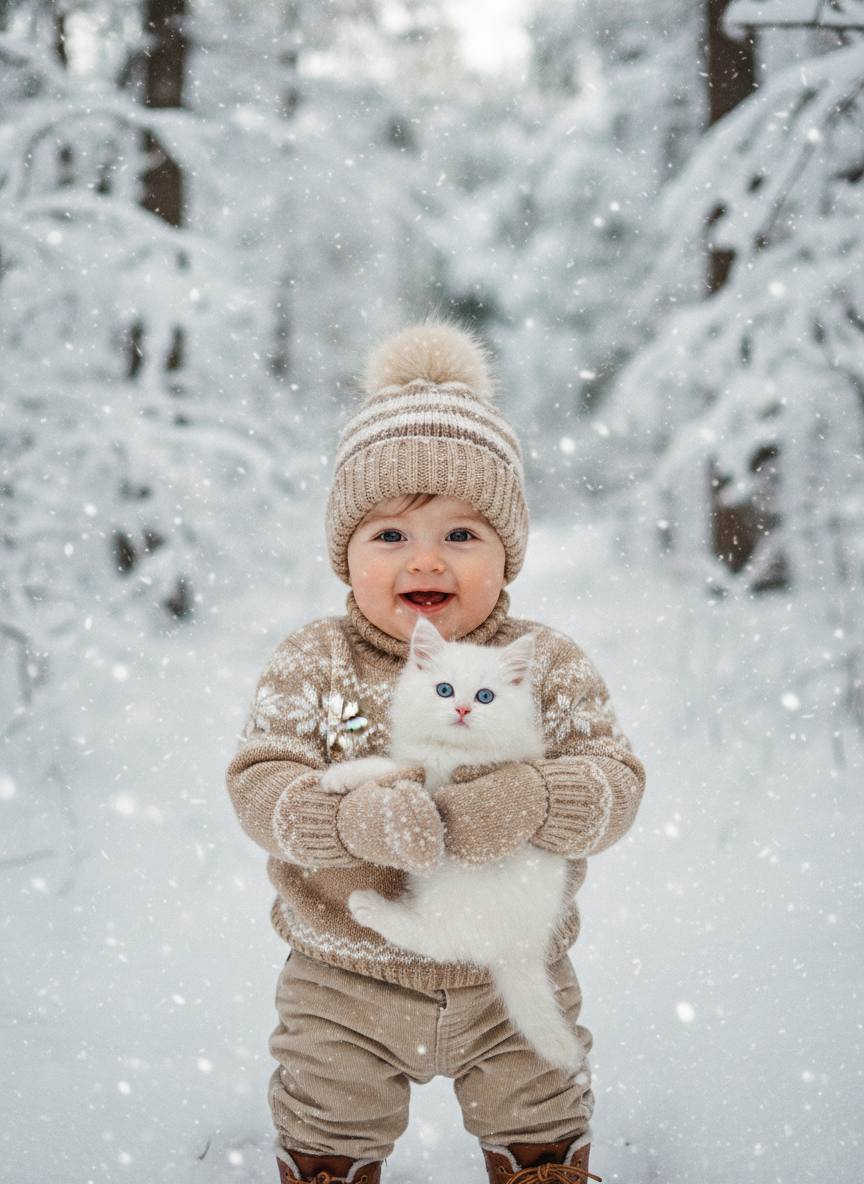 В руках он держит пушистого белого котенка с голубыми глазами. Ребенок улыбается