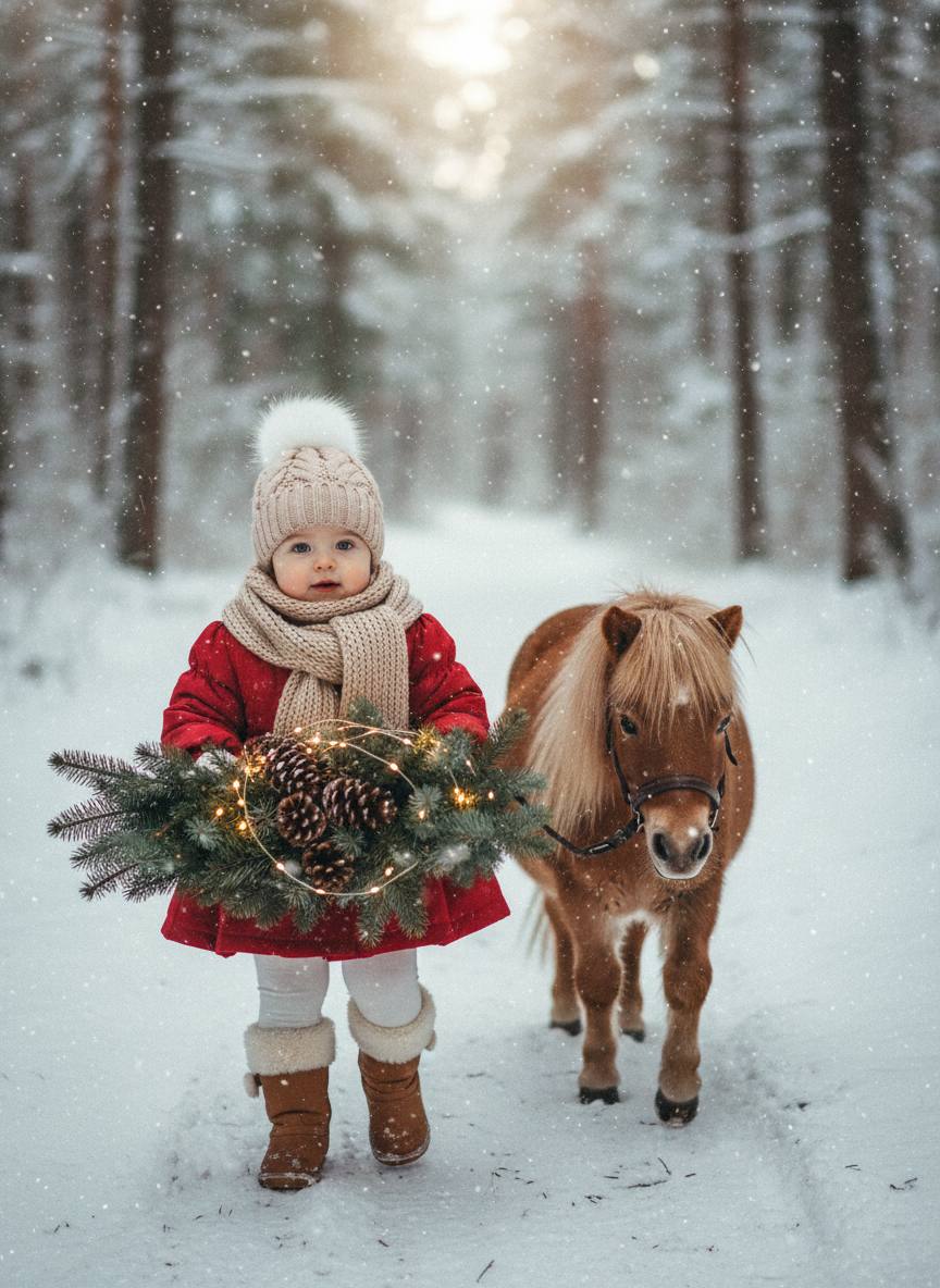 В руках он держит большой еловый букет, с шишками и гирляндой с теплым светом. А рядом с ним идет маленькая лошадка-пони, она коричневая с ухоженной гривой