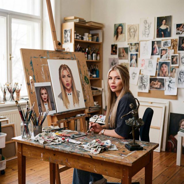 Промт для создания кинематографического изображения женщины, рисующей автопортрет в художественной студии. Изображение включает в себя высококачественные детали, резкость и естественное освещение, создавая реалистичный и теплый портрет. Используется профессиональная камера и объектив для достижения максимальной четкости и глубины изображения.