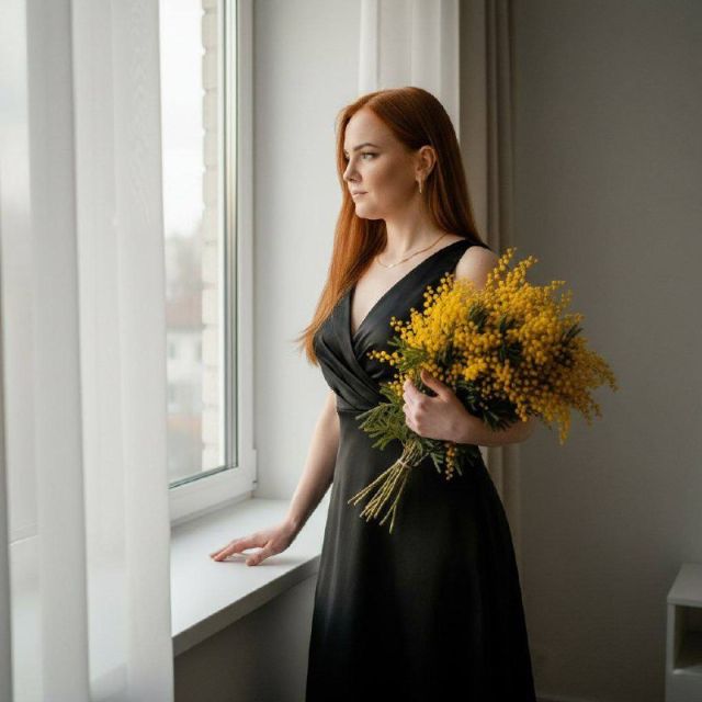 Фотореалистичная портретная fashion-съёмка, девушка в атласном вечернем чёрном платье, с большим букетом мимоз стоит у большого окна в домашнем современном эстетичном интерьере, корпус развёрнут в три четверти, одна рука мягко лежит на подоконнике, вторая опущена вдоль тела, осанка ровная, вытянутая, поза элегантная и сдержанная, голова слегка наклонена, взгляд направлен в сторону окна, выражение спокойное, утончённое. Локация — квартира с минималистичным интерьером, светлые стены, полупрозрачные шторы, фон чистый, не перегруженный. Кадр по пояс или три четверти, акцент на силуэт платья и линию шеи. Камера Canon EOS R5 + 85mm. Освещение — мягкий естественный свет из окна, вечерний, рассеянный, без жёстких теней, лёгкая подсветка с противоположной стороны для отделения фигуры от фона. Цветокоррекция кинематографичная: глубокие чёрные, тёплые нейтральные оттенки кожи, лёгкий контраст, чистая кожа без шума и зерна.