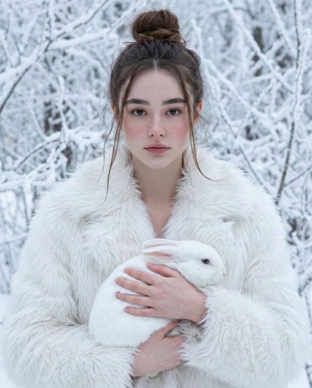 Background: white winter forest, branches covered with frost. Light is soft, cold, and diffused. Photorealism, high detail of fur, skin, and the rabbit’s coat.