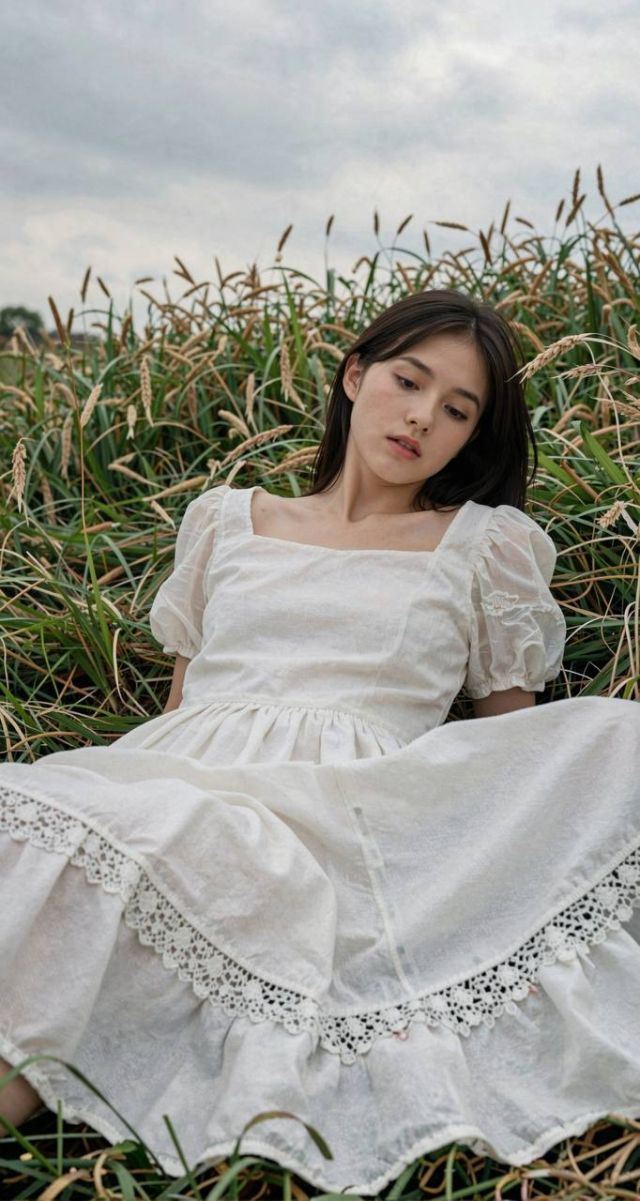 A gently contemplative moment captured as if on an iPhone, presenting a young woman reclining softly in tall grass beneath a cloudy sky. She wears a minimalist Jenny Fax-inspired white dress crafted from light cotton, subtly detailed with sheer puff sleeves and delicate scalloped lace trimming at the hem. Her straight dark hair is parted naturally, framing a serene, introspective expression enhanced by fresh, minimal makeup. The soft, diffused overcast light filters uniformly, accentuating the tender fabric textures and the gentle rustle of grasses. Surrounding her, the vintage-evocative meadow blends into a muted palette of soft greens and creams, while the natural layering of her dress offers an intimate tactile contrast. Framed slightly tilted and elevated, the composition balances elegant simplicity and wistful, casual charm, embodying Jenny Fax’s whimsical femininity and quiet vintage romance.