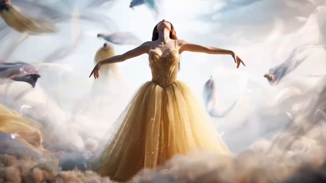 Woman in long luxorios tull dress, light yellow, golden color, the realm of the Air, magical winds environment, spirits of the air and wind floating around, textured optic fiber octane render dynamic pose volumetric lighting perfect shading unreal engine realistic ethereal sky –relax —