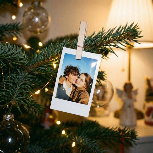 Create a scene with a New Year’s tree in warm evening lighting. The main focus is a small printed photo of the user in instant photo style with a white frame, hanging from a Christmas tree branch and attached with a wooden clothespin. The camera is at object level, with a slight macro effect, focus on the photograph, and shallow depth of field. The fir branches have dark green needles, surrounded by warm yellow fairy lights with soft bokeh. In the background, blurred Christmas decorations: glass ornaments, an angel figurine or toys, without drawing attention away from the main subject. Lighting is soft, warm, and cozy, with natural reflections on the needles and the photo frame. The atmosphere is intimate and nostalgic, conveying the feeling of a home holiday and a captured memory. Color grading is warm and natural, with slight grain and the effect of a lively amateur photograph. Do not change the original user photo.