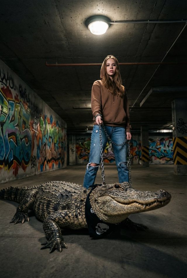 A realistic photo of a young women image for face reference wearing a brown hoodie and ripped jeans holding a large alligator on a heavy metal chain leash in an underground parking lot covered with colorful graffiti walls, cinematic lighting from a single ceiling lamp above, the alligator wearing a black bandana with a skull logo, dramatic street style urban atmosphere, realistic textures, high detail, 8K, low angle shot, gritty tone. Hd clear
