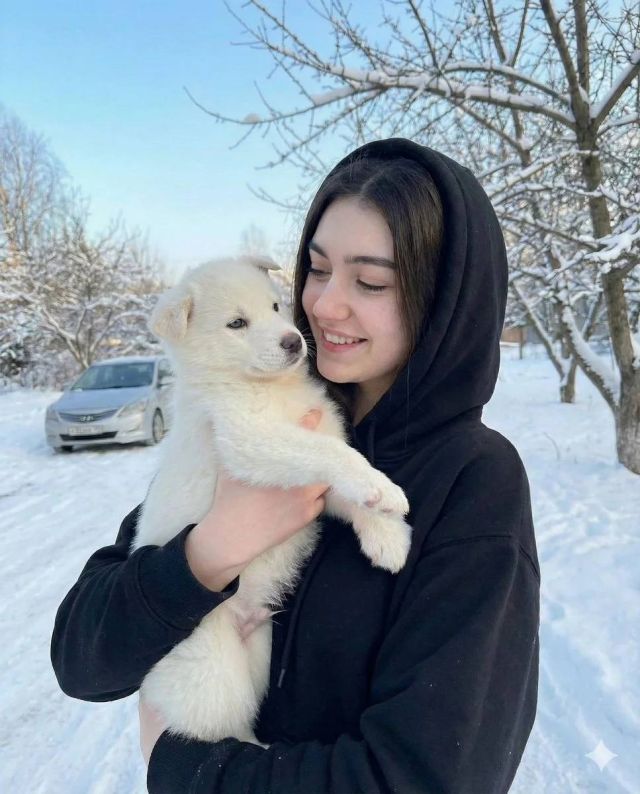 Create a portrait of yourself with puppy in snow. Image description with subject face preserved, reference match enabled for accurate face reproduction.