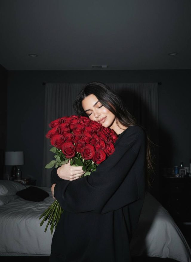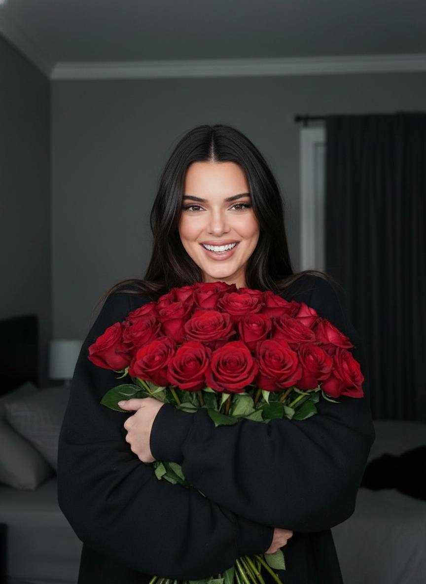 Используй загруженное фото как единственный и абсолютный эталон. СТРОГО сохранить внешность, лицо, кожу, возраст, пропорции, мимику и позу 1:1, без улучшений и идеализации. Камера Sony FX2, вертикальный кадр, статичная съёмка, камера на уровне лица, фиксированная дистанция. Девушка обнимает очень большой букет красных роз, прижимая к груди. Голова виском лежит на букете, глаза закрыты, нежная улыбка. Волосы распущены, лежат свободно, без укладки. Одежда: чёрный оверсайз-свитшот с длинными рукавами. Освещение СТРОГО: один источник — жёсткий фронтальный on-camera flash, прямой свет в лоб, холодная нейтральная температура, пересветы допустимы, жёсткие тени за объектом обязательны. Запрещён soft light, ambient light, оконный свет. Фон: реальный домашний интерьер ночью, тёмная спальня, серо-чёрные стены, различимы силуэты кровати и штор, без декоративного и цветного света. Атмосфера raw, candid, эффект случайного ночного фото со вспышкой.