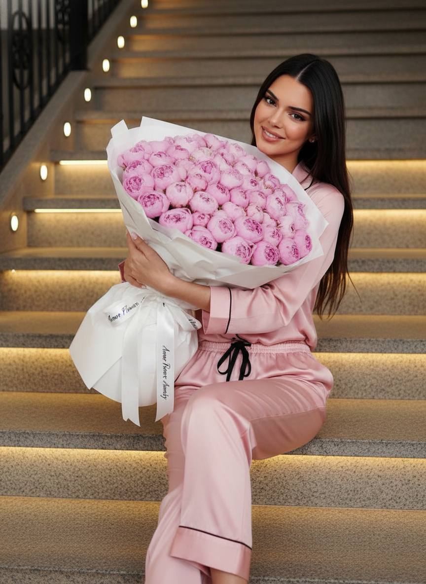 На фото девушка сидит на ступенях, рядом с огромным букетом пионов, который она держит в руках, прижимая к себе. Она выглядит расслабленной и счастливой, с лёгкой улыбкой на лице. Букет огромный, розовых пионов в красивой белой упаковке с бантом, на котором написано “Amor Flowers Almaty”, добавляет в кадр элегантности и нежности.