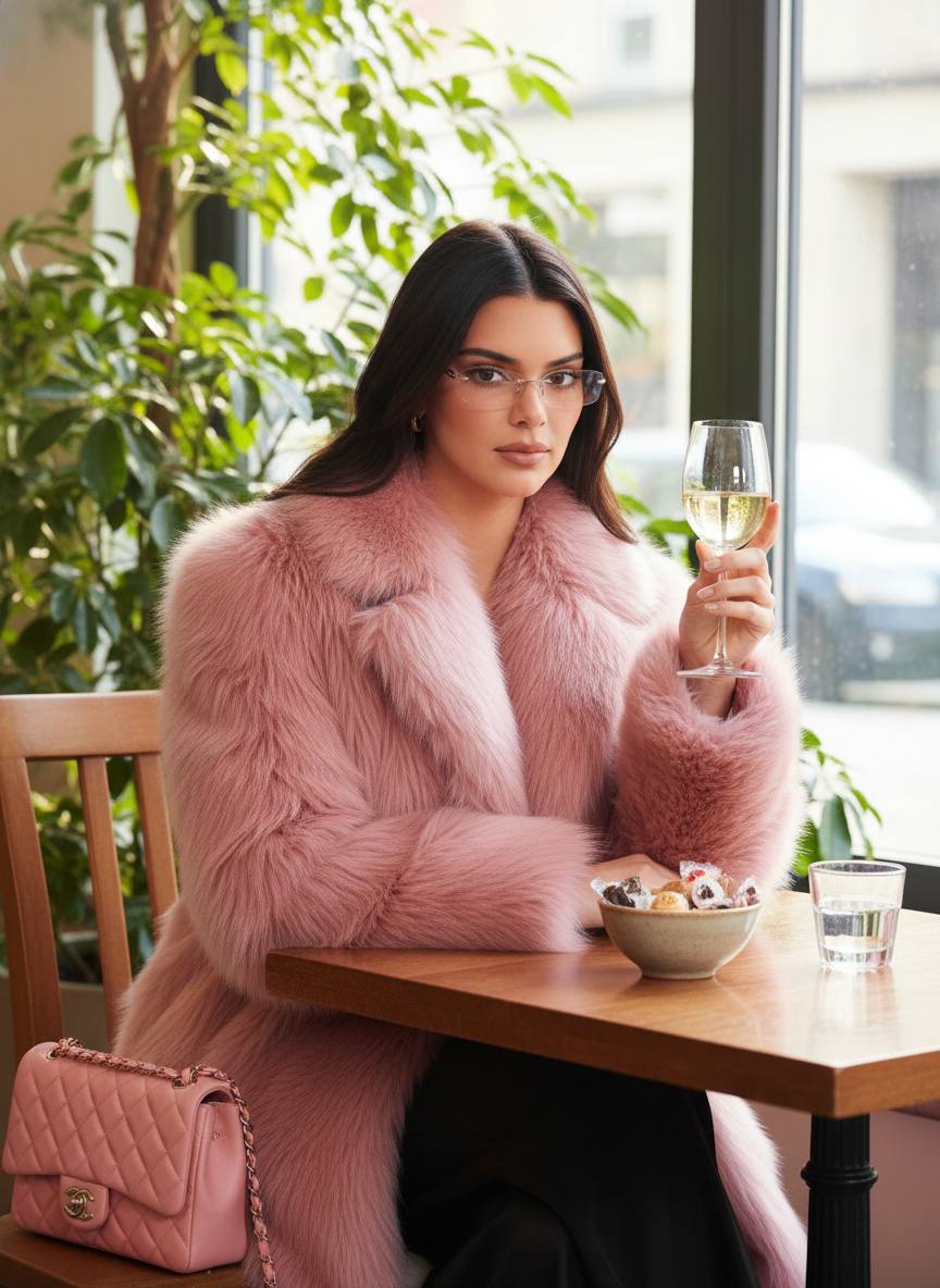 Сохрани черты лица девушки с фото. Женщина сидит за столом в уютном кафе, наслаждаясь моментом с бокалом белого вина в руке. Она одета в роскошную розовую шубу с длинным мягким ворсом, которая создаёт эффект уюта и изысканности. Очки узкие полупрозрачные с ярким розовым оттенком добавляют ей современный и стильный вид. На столе рядом с ней — чаша с десертами, аккуратно завернутыми в бумагу, а также стакан с водой, придавая композиции лёгкость и непринуждённость. Женщина смотрит в камеру с уверенным и расслабленным выражением лица, подчеркивая её элегантность. Рядом стоит стильная розовая сумка Chanel, добавляя акцент на роскошь. Интерьер кафе с зелёными растениями и мягким светом, проникающим через окна, создаёт атмосферу уюта и тепла. Окружение гармонично сочетает в себе элементы модного стиля и классического шика.