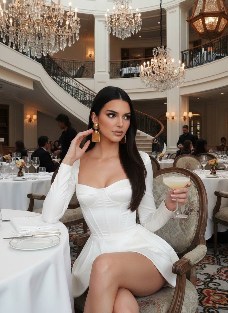Она сидит за столиком на красивом стуле. Видно её полностью, нога на ногу. Одной рукой она поправляет волосы у уха, второй держит бокал с белым коктейлем.