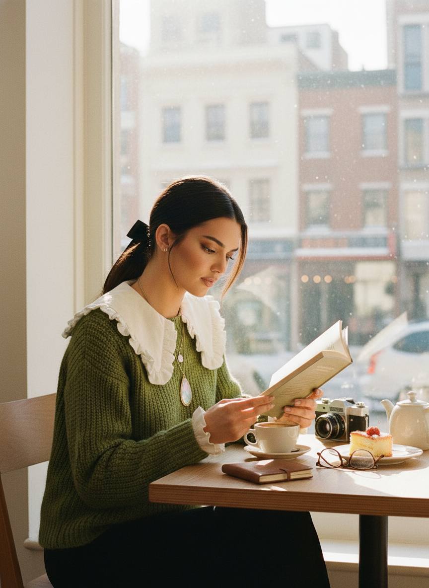 Не меняй черты лица. На фотографии девушка сидит в кафе за столом, на фоне большого окна, через которое виднеются зимние городские здания. Она поглощена чтением книги, держа её в руках. Девушка в уютном зеленом свитерке с рюшами и крупной вязкой, белая блузка с пышным воротником выглядывает из-под свитера, придавая образу утонченность. Её волосы аккуратно собраны в низкий хвост с помощью атласной ленты. Макияж нежный, с акцентом на глаза и губы. На её шее висят изящные украшения, а также виден кулон с перламутровым отблеском. На столе рядом с ней чашка кофе, чайник с чаем, тарелка с десертом, а также камера и несколько других предметов. Атмосфера спокойная, уютная, светлый интерьер кафе в сочетании с мягким естественным освещением, проникающим через окно, создает чувство умиротворения и расслабления. Фото выполнено в кинематографическом стиле с добавлением зерна, что усиливает атмосферу ретро и придает снимку особую теплоту и живость.