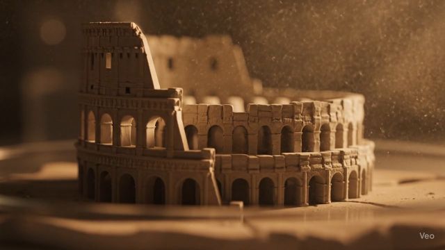 Когда капля касается поверхности, камера остаётся близко и полностью сфокусирована на месте соприкосновения. Древний камень начинает пузыриться и подниматься, словно оживая, постепенно формируя иконическую структуру Колизея в потрясающей детализации. Процесс напоминает таймлапс-рост, когда части конструкции собираются изнутри наружу, кирпич за кирпичом, арка за аркой.