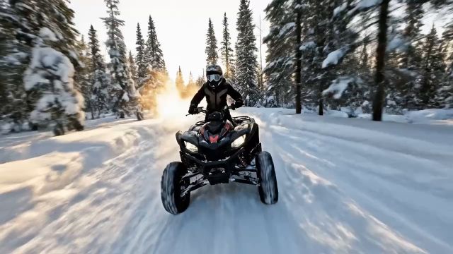 Создайте захватывающую сцену с квадроциклом, мчащимся по заснеженному лесному пути. Используйте динамичную съемку с широкоугольной перспективы дрона, чтобы запечатлеть мощь и скорость. Снег разлетается во все стороны, когда квадроцикл дрифтует на поворотах. Водитель в темной зимней одежде и отражающих очках, а заснеженные сосны размываются на заднем плане. Звук двигателя и хруст льда под шинами создают атмосферу, а золотистый зимний свет пробивается сквозь деревья, добавляя кинематографического контраста и драматичности.