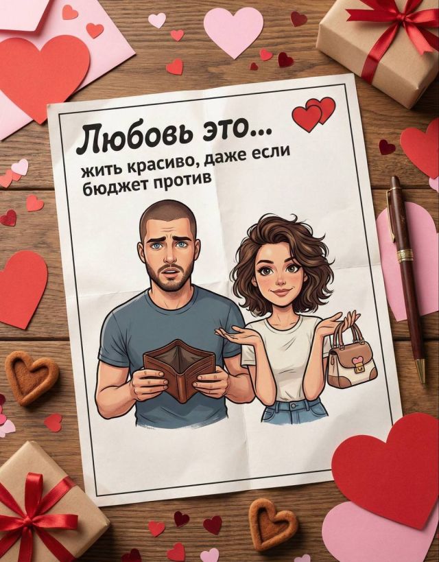 Гиперреалистичное, детализированное фото винтажного вкладыша от жевательной резинки “Love is…”, слегка мультяшная иллюстрация милой пары по референсу, где девушка показывает экран телефона с подозрительным лайком, а парень резко делает вид, что ничего не знает, забавная надпись о любви: “Любовь это… пережить один лайк и остаться семьёй”. Изображение должно выглядеть как реальное фото физического вкладыша на столе, вокруг на столе разбросаны валентинки, открытки, маленькие сердечки, ленты и другие предметы ко Дню святого Валентина. Высокое разрешение, профессиональное студийное освещение, малая глубина резкости, тема Дня святого Валентина.