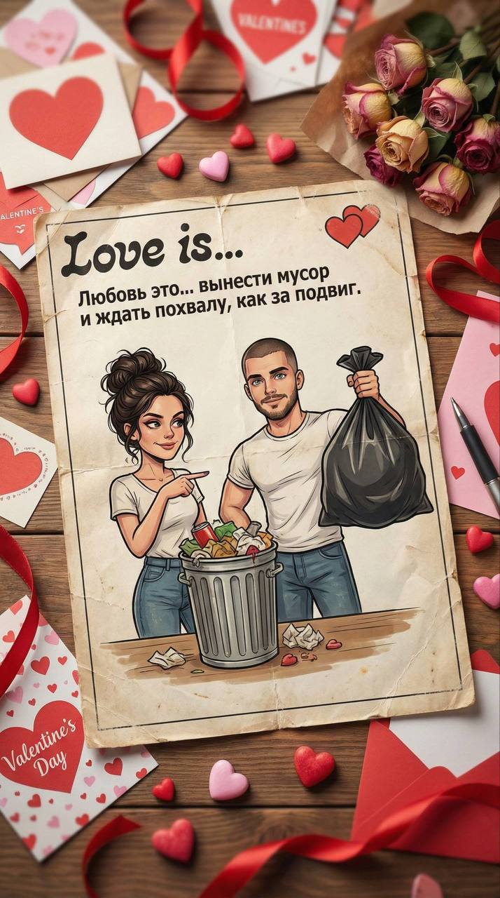 Гиперреалистичное, детализированное фото винтажного вкладыша от жевательной резинки “Love is…”, слегка мультяшная иллюстрация милой пары по референсу, где девушка указывает на мусорное ведро, а парень героически держит пакет как победитель, забавная надпись о любви: “Любовь это… вынести мусор и ждать похвалу, как за подвиг”. Изображение должно выглядеть как реальное фото физического вкладыша на столе, вокруг на столе разбросаны валентинки, открытки, маленькие сердечки, ленты и другие предметы ко Дню святого Валентина. Высокое разрешение, профессиональное студийное освещение, малая глубина резкости, тема Дня святого Валентина.