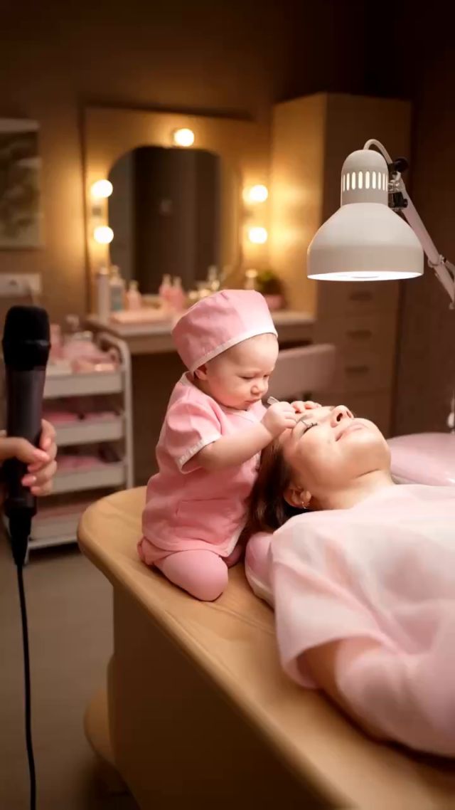 4K cinematic video (16:9). Cozy beauty salon interior, warm soft lighting. A newborn-size baby girl in tiny pink beautician uniform stands on a small stool next to a reclining client, carefully applying eyelash extensions with tiny hands. Medium close-up, beauty-blog style, focus on baby’s face and hands. A handheld microphone is near her; off-screen reporter asks in Russian: «Ты чего работаешь тут, малышка?» Baby responds in Russian: «Ты видела цены на агушу? Приходится помогать родителям зарабатывать.» Mouth movements perfectly match speech. Audio: clean baby voice, soft salon ambience, quiet music, distant tool sounds. No subtitles, no text overlay.