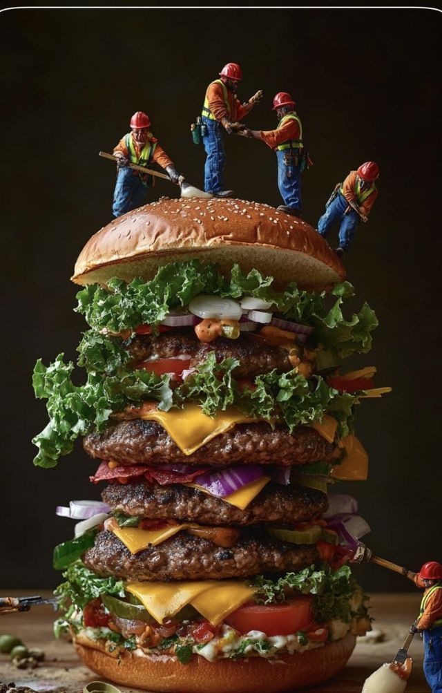 Это концепт в жанре креативной фуд-фотографии с элементами фантазии. В центре кадра — гигантский гамбургер, на котором работают крошечные строители, словно доставляющие его к столу. Фон однотонный и чистый, что подчёркивает главный объект и создаёт рекламную подачу. Атмосфера студийной съёмки передана с помощью аккуратного освещения и высокой детализации: каждая текстура булочки, мяса и овощей проработана максимально реалистично. Изображение имитирует фотосъёмку на камеру Sony A7c с объективом Fujifilm XF 20mm f/3.6, в стиле премиальной food-рекламы.