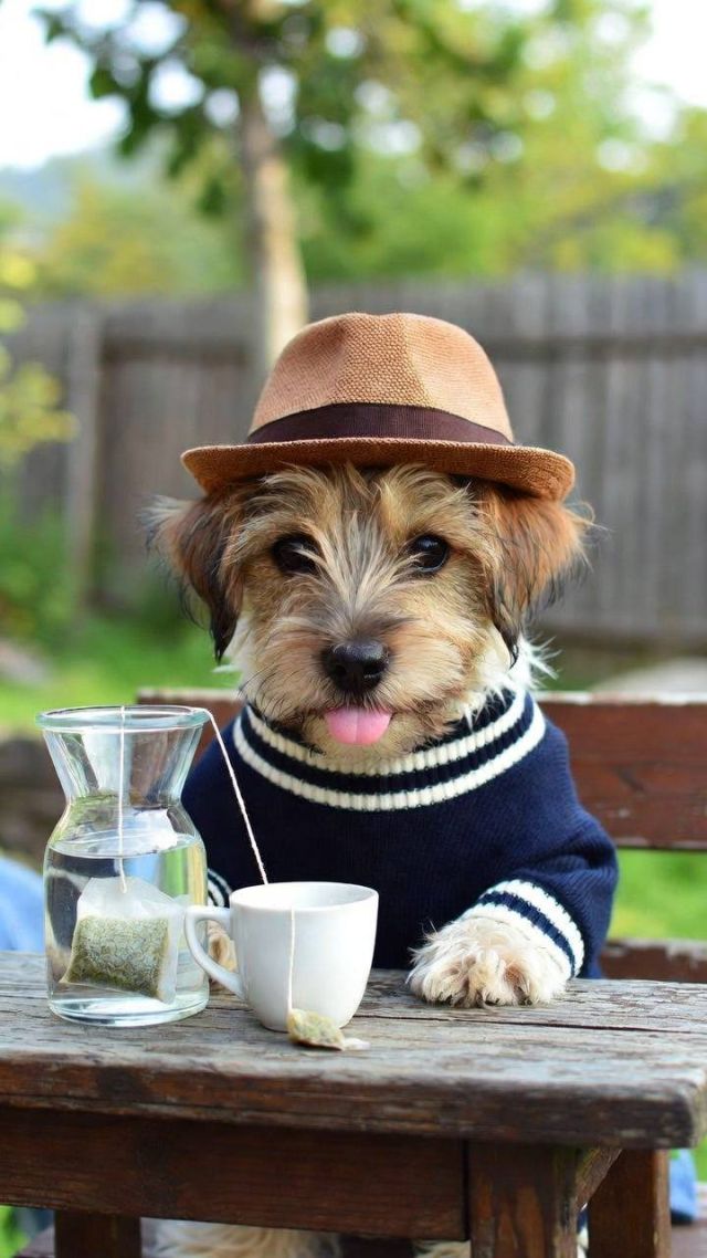 a photograph of an anthropomorphic jack russell terrier wearing a sweater and hat, sitting on an outdoor table, pouring water from a glass vase into a white cup with a tea bag in it. the scene is set outdoors during the daytime and was posted to snapchat in 2018.